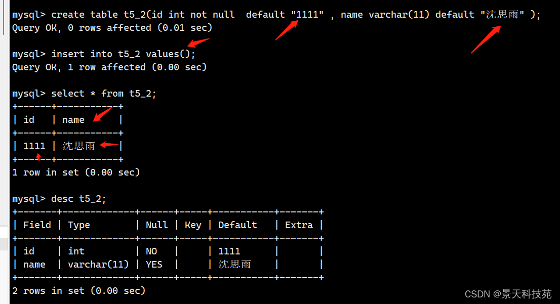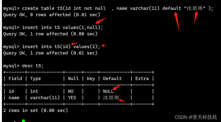 create table t5(id int not null , name varchar(11) default "沈思雨" );