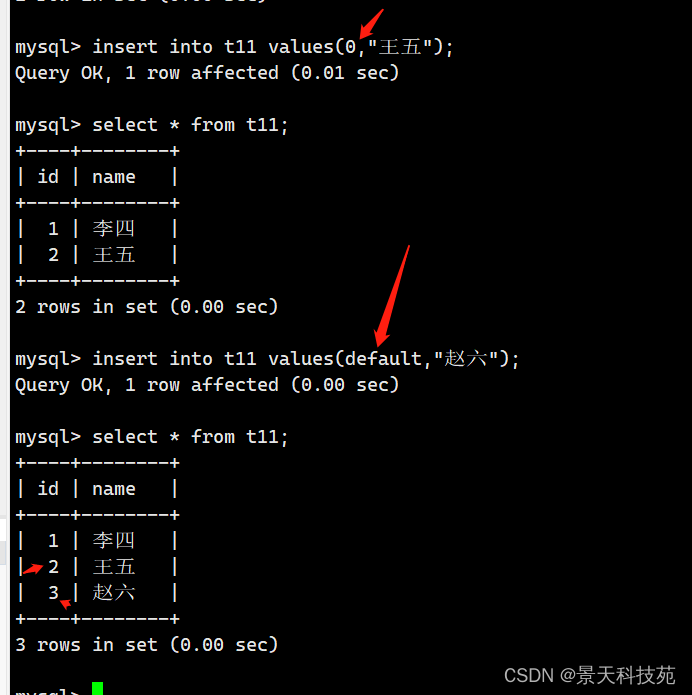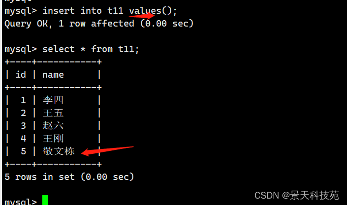 insert into t5_二 values(); # 正在values内中没有写值,默许利用默许值;