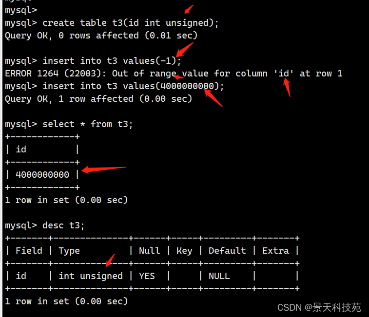 insert into t3 values(4000000000); success配置无标识表记标帜位约束,拔出负值便报错