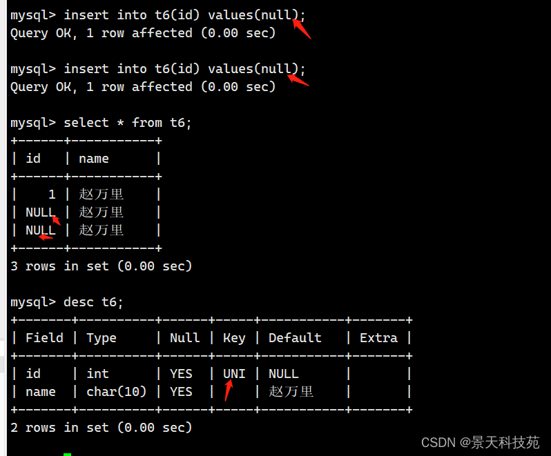 insert into t6(id) values(null); # id酿成了多个null假设要增除了null的字段,否以用 where 字段 is null 来增