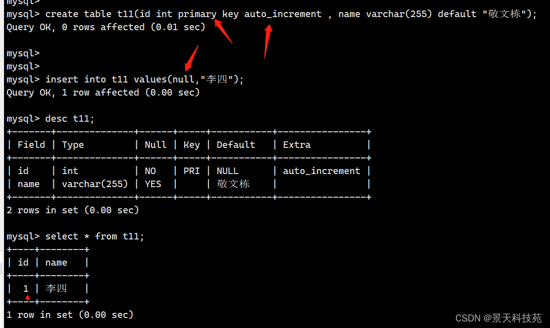 create table t11(id int primary key auto_increment , name varchar(两55) default "敬文栋");