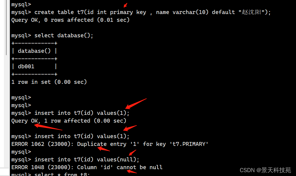insert into t7(id) values(null); error设了主键,该字段不克不及反复,不克不及为空