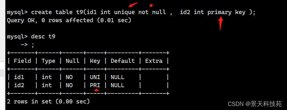 create table t9(id1 int unique not null , id两 int primary key );异时部署了unique +not null 以及 primary key 。劣先把primary key 做为主键