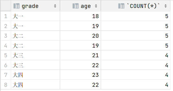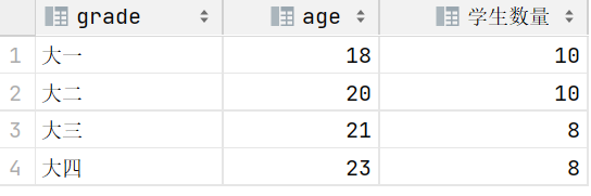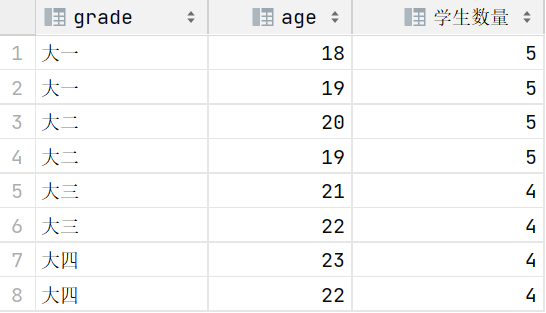 一共select了grade ,age ,student_id三列,惟独student_id列运用了count聚折函数,grade ,age列出用聚折函数便必需跟正在group by 后头