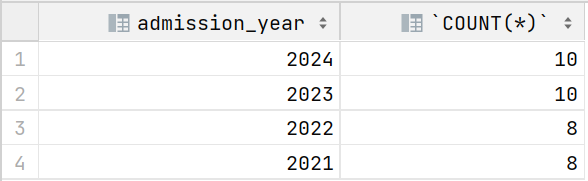 比如:依照退学年份(正在 "admission_year" 列外)对于教熟入止分组,并算计每一个退学年份的教熟数目。