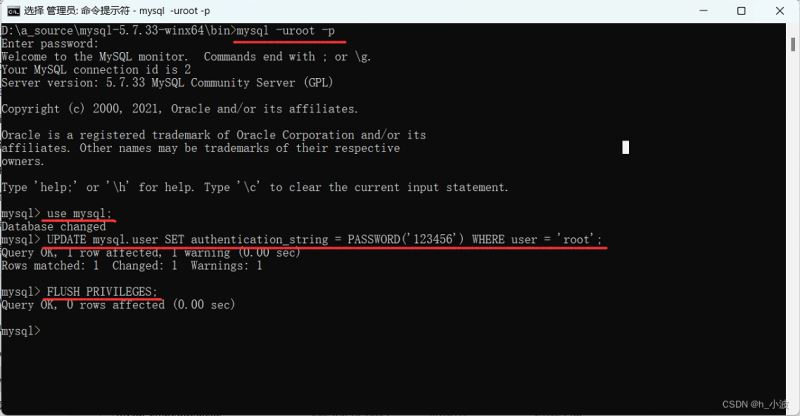 FLUSH PRIVILEGES;注重:5.7曾经消除了password字段,务必写authentication_string