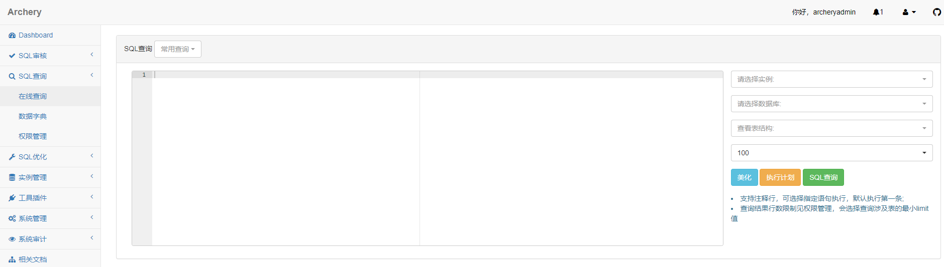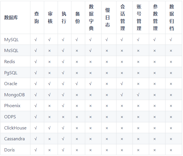 特性:SQL审核、SQL上线、SQL阐明、SQL查问、SQL劣化、数据回档、真例收拾、对象插件、权限办理。