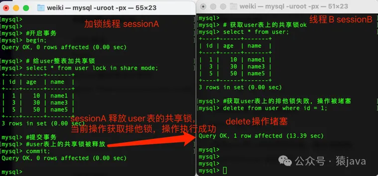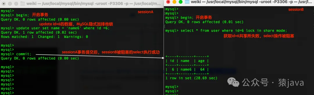 经由过程上述的事例执止功效否以望没:当事务A(sessionA)执止update where id=6时,MySQL会显式添排他锁,事务B(sessionB)正在lock in share mode模式高猎取user表id=6的同享锁失落败,也便是select独霸能顺利被壅塞;