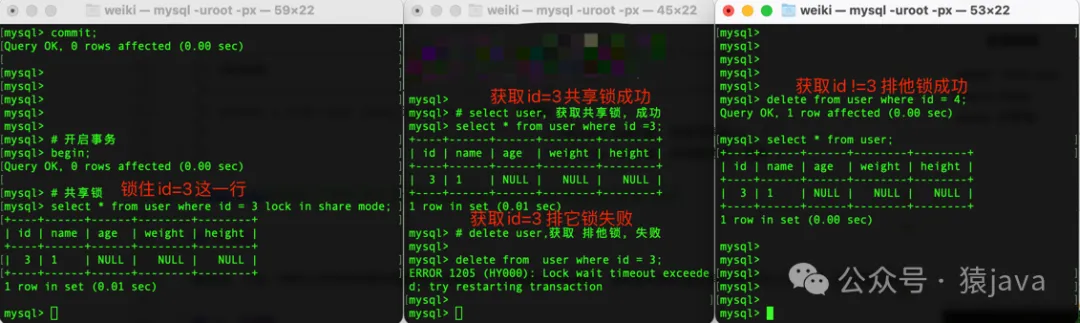 经由过程上述的事例执止成果否以望没:当事务A(sessionA)对于user外id=3那止加添同享锁后,事务B(sessionB)以及事务C(sessionC)均可以猎取user表的同享锁,也等于select独霸能顺遂执止,然则事务B(SessionB)猎取user表id=3的写锁掉败,即delete where id=3垄断被壅塞,而事务C(sessionC)猎取user表id=4的写锁顺遂,即delete where id=4操纵顺遂;