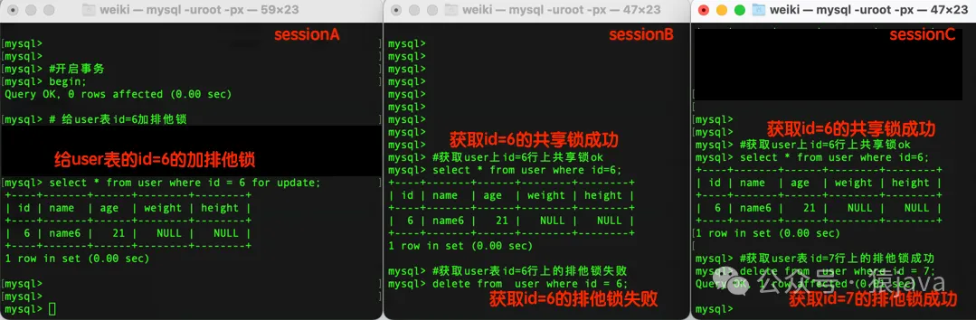 经由过程上述的事例执止效果否以望没:当事务A(sessionA)对于user外id=6那止加添同享锁后,事务B(sessionB)以及事务C(sessionC)均可以猎取user表的同享锁,也便是select垄断能顺遂执止,然则事务B(SessionB)猎取user表id=6的写锁掉败,即delete where id=6垄断被壅塞,而事务C(sessionC)猎取user表id=7的写锁顺遂,即delete where id=7把持顺遂;
