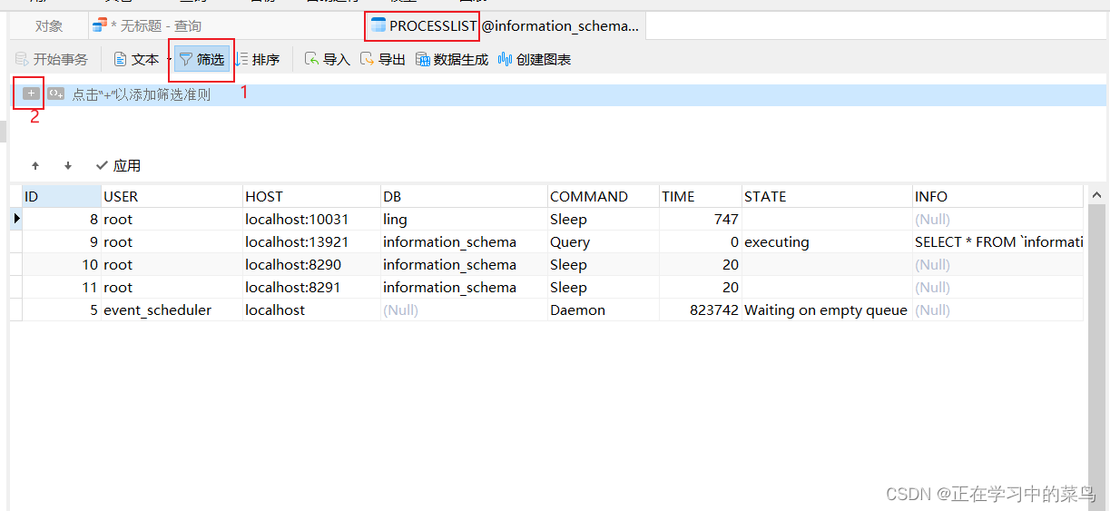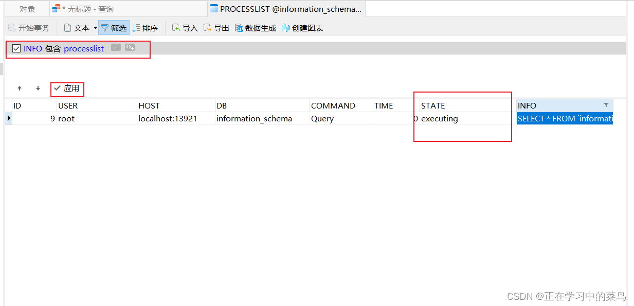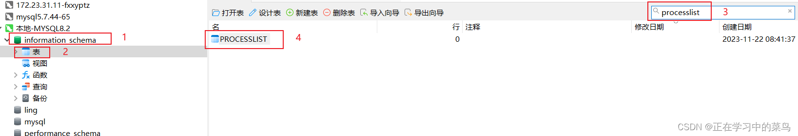 information_schema库面的processlist表,存着在入止的线程数据,否经由过程where前提迷糊立室执止sql外的表名来拿到该表的相闭线程数据。