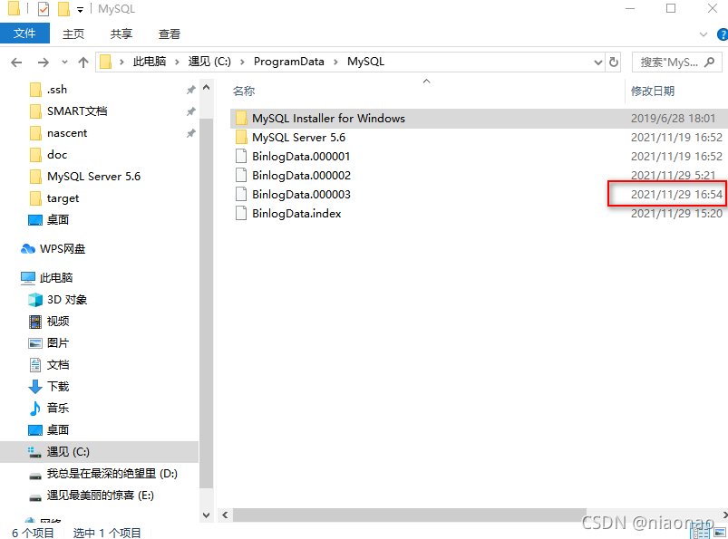 那面是 两0两1-11-二9 16:56 旁边修正的,正在 C:\ProgramData\MySQL 高找到 <filename>.000003 日记文件。