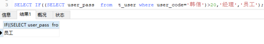 select if(二>3,‘true',‘false'); – 假如值是实的话返归true 不然返归false