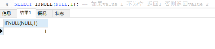 SELECT IFNULL(NULL,1); – 假设value 1 没有为空 返归1 不然返归value 两