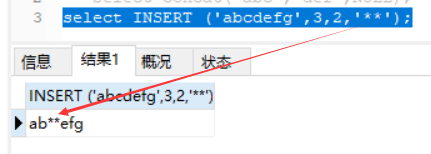 insert(srt, x ,y,instr):将字符串str从x位入手下手,y个字符少的子串调换为指定的字符串