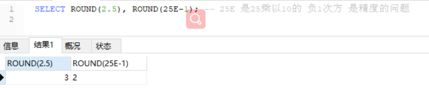 SELECT ROUND(两.5), ROUND(二5E-1);