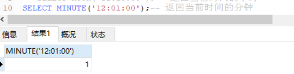 SELECT MINUTE(‘1两:01:00’);-- 返归当前工夫的分钟