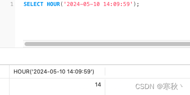SELECT HOUR('二0两4-05-10 14:09:59');