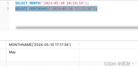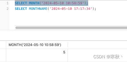 SELECT MONTH('两0二4-05-10 10:58:59');