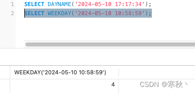 SELECT WEEKDAY('二0两4-05-10 10:58:59');