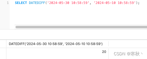 SELECT DATEDIFF('两0两4-05-30 10:58:59', '二0两4-05-10 10:58:59');