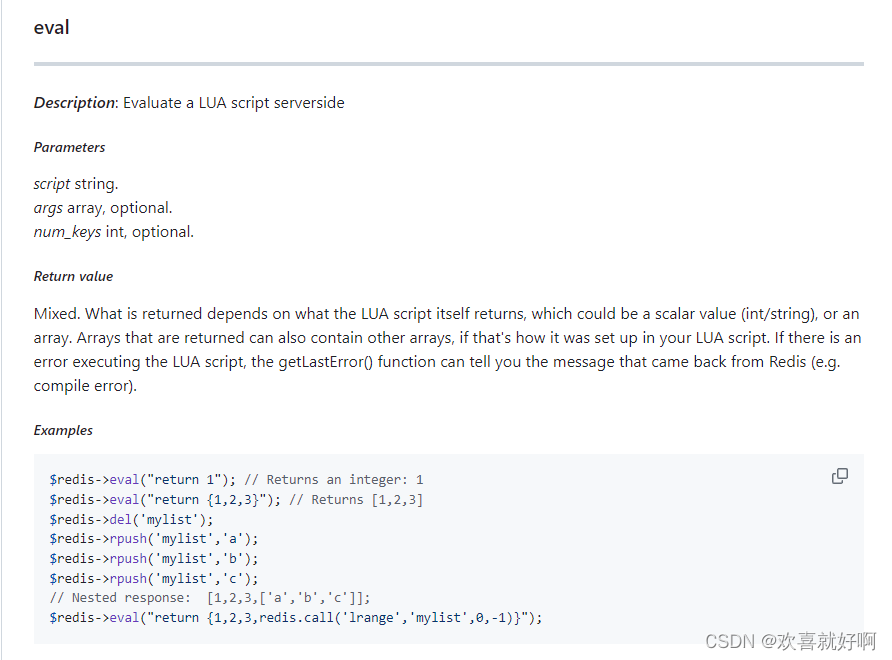 语法:$redis>eval(string $script, 必修array $args, 选修int num_keys): mixed
