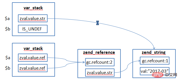 $a = date("Y-m");$b = &$a;$a为字符串,经由过程&$a将其转化为援用范例并赋值给了$b,转换后的$a的范例由IS_STRING变为IS_REFERENCE,$a的value也转变为zend_reference布局,那个布局指向本来的字符串。