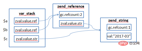 php外变质名→zval,变质值→zend_value。其变质内存是经由过程援用计数管束的,正在php7" target="_blank">php7外援用计数正在value组织外。