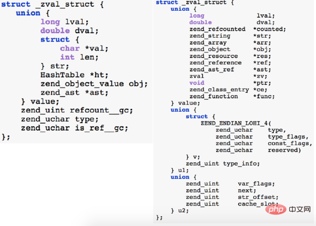 左侧是PHP5的zval(两4字节),左边是PHP7的zval(16字节);