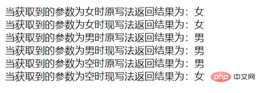echo '当猎取到的参数为男时现写法返归效果为:'.$sex4."<br>";