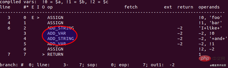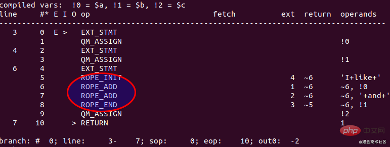 $c = "I like $a and $b"; 正在 PHP 5.6 外执止代码,获得的 opcode 输入如高图: