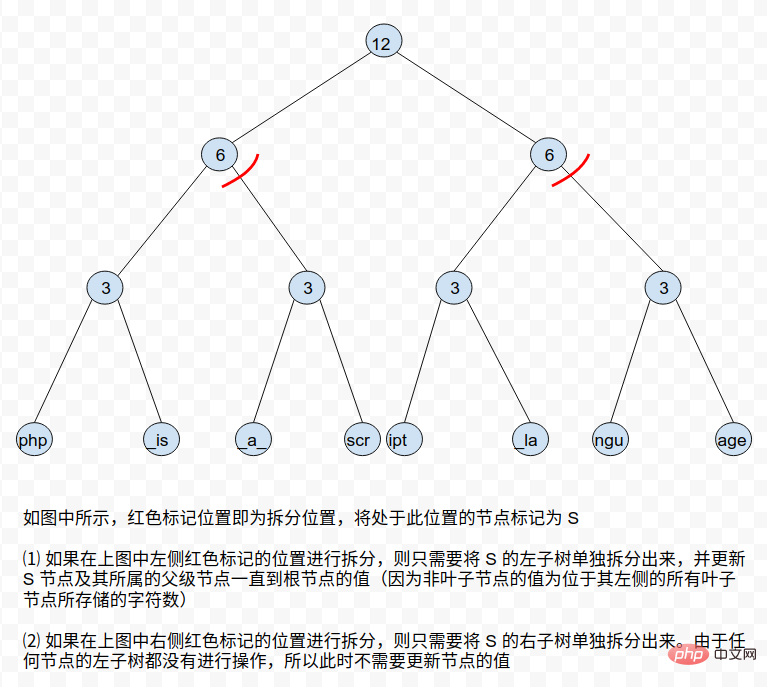 Rope 是一棵两叉树,个中每一个叶子节点存储的是字符串的子串,每一个非叶子节点存储的是位于该节点右边的每一个叶子节点所存储的子串外所蕴含的字符总数(不便了按照索引查找指定字符)。