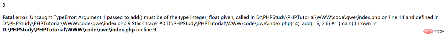 php5是无奈执止下面代码的,php7执止的时辰会先输入一个3以及一个报错( Argument 1 passed to add() must be of the type integer, float given);