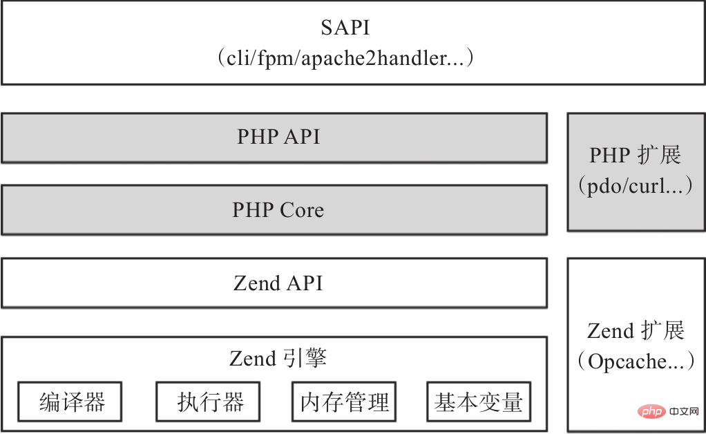 Zend引擎外蕴含了编译器息争释器,从PHP代码到opcode的执止,均由Zend引擎实现。