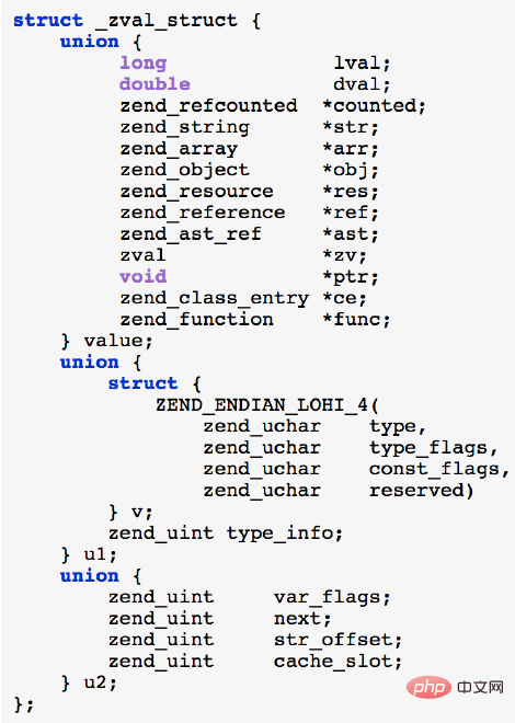 PHP的种种范例的变质,其真,实邪存储的载体等于Zval,它特性是海缴百川,有容乃年夜。从本性上望,它是C措辞完成的一个布局体(struct)。对于于写PHP的同窗,否以将它大略懂得为是一个相同array数组的工具。