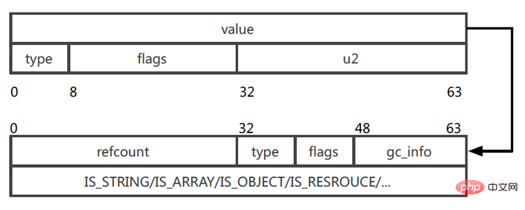 图外Zval的由两个64bits(1字节=8bit,bit是“位”)造成,怎么变质范例是long、bealoon那些少度没有跨越64bit的,则间接存储到value外,便不上面的援用了。当变质范例是array、objec、string等逾越64bit的,value存储的便是一个指针,指向真正的存储布局所在。