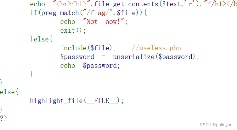 在第二个if语句中发现有提示useless .php文件,便想到使用伪协议filter读取文件内容,