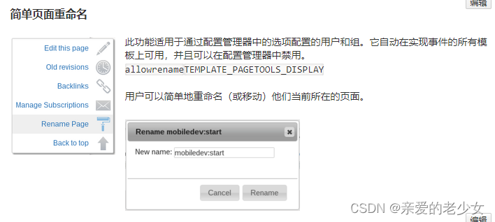 这个插件允许移动包含媒体文件的页面和名称空间,并自动调整指向这些页面的所有链接和媒体引用。 此插件不更新 ACL 规则。例如,如果您有一个 ACL 规则,该规则对某个 wiki 页面进行读保护,那么在移动该页面之后,该规则将不再有任何效果。除了重命名一个页面外,该插件需要管理员特权才能使用。