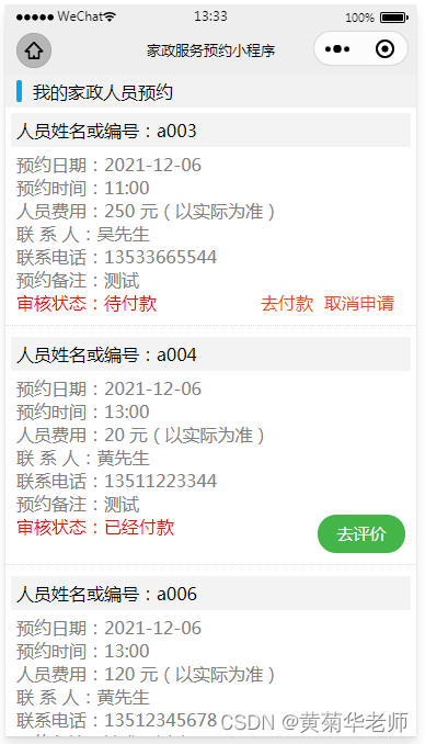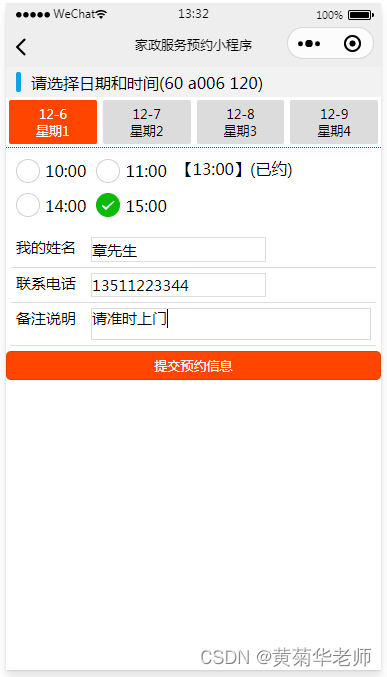 家政人员预约:选择日期,选择时间点,填写预约姓名、电话、备注等提交