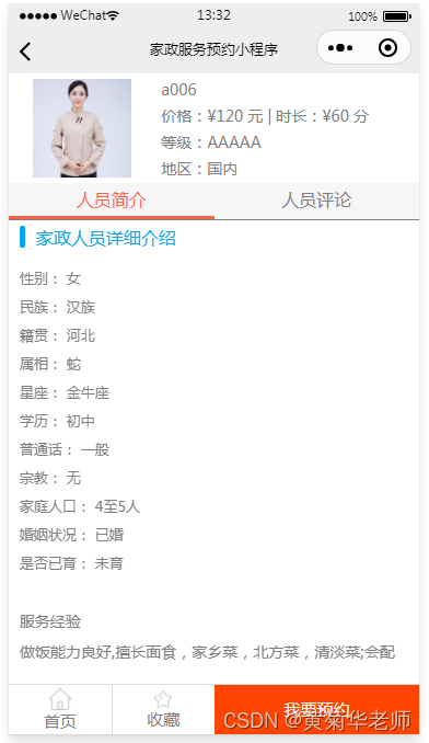 家政人员详情:显示家政人员的头像、价格、服务、介绍等
