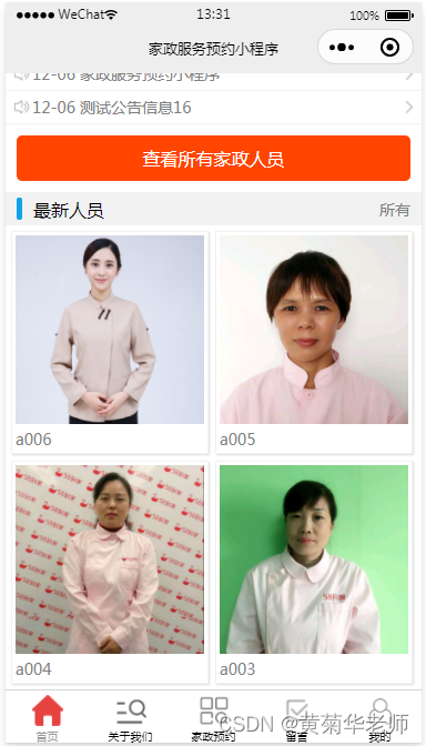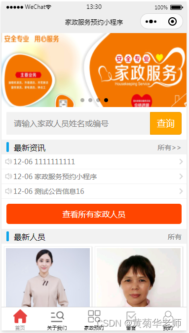 目的:本课题主要目标是设计并能够实现一个家政服务预约的微信小程序系统,前台用户使用小程序查找家政人员并预约,后台管理使用基于PHP+MySql的B/S架构;通过后台添加资讯、录入家政人员信息、管理家政服务预约订单等。
