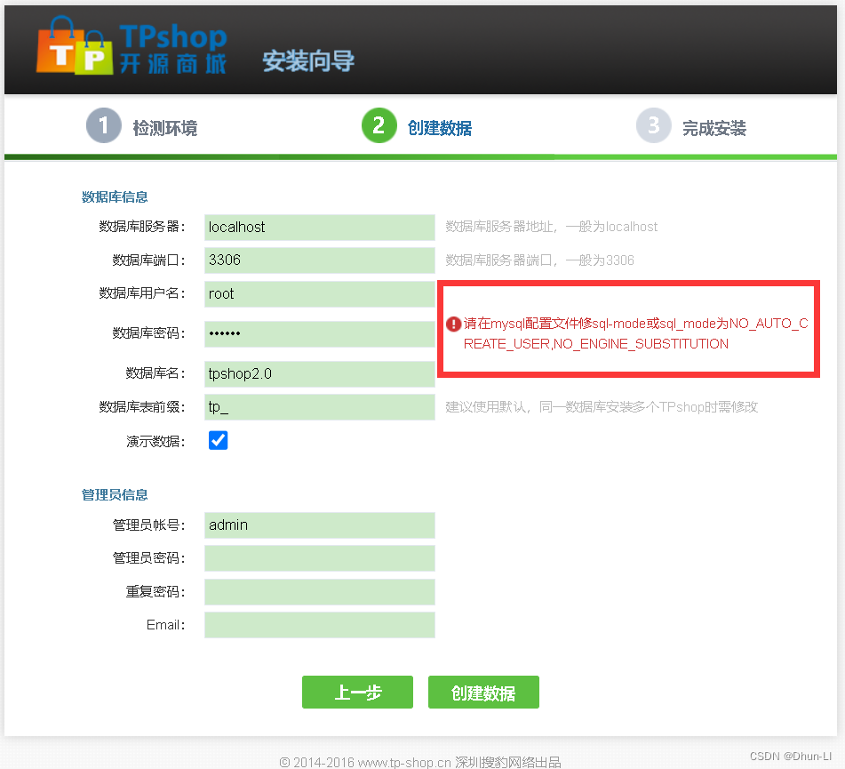 服务器、端口、数据库名、前缀默认即可,需要填写数据库用户名、密码、和管理员信息