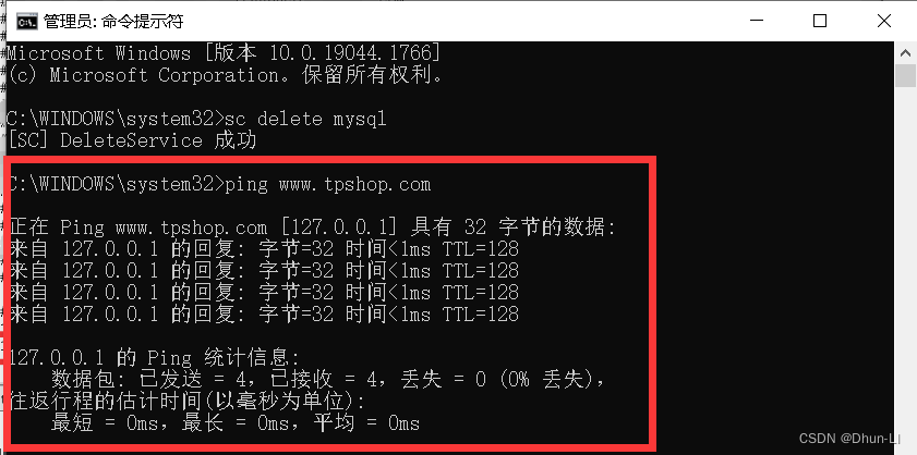 管理员运行的cmd中输入:ping www.tpshop.com,出现以下内容表示连通。