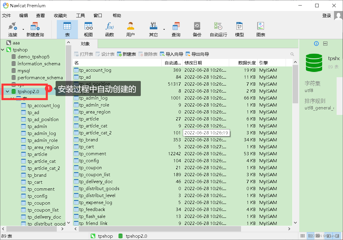 navicat中可看到创建好的数据库: