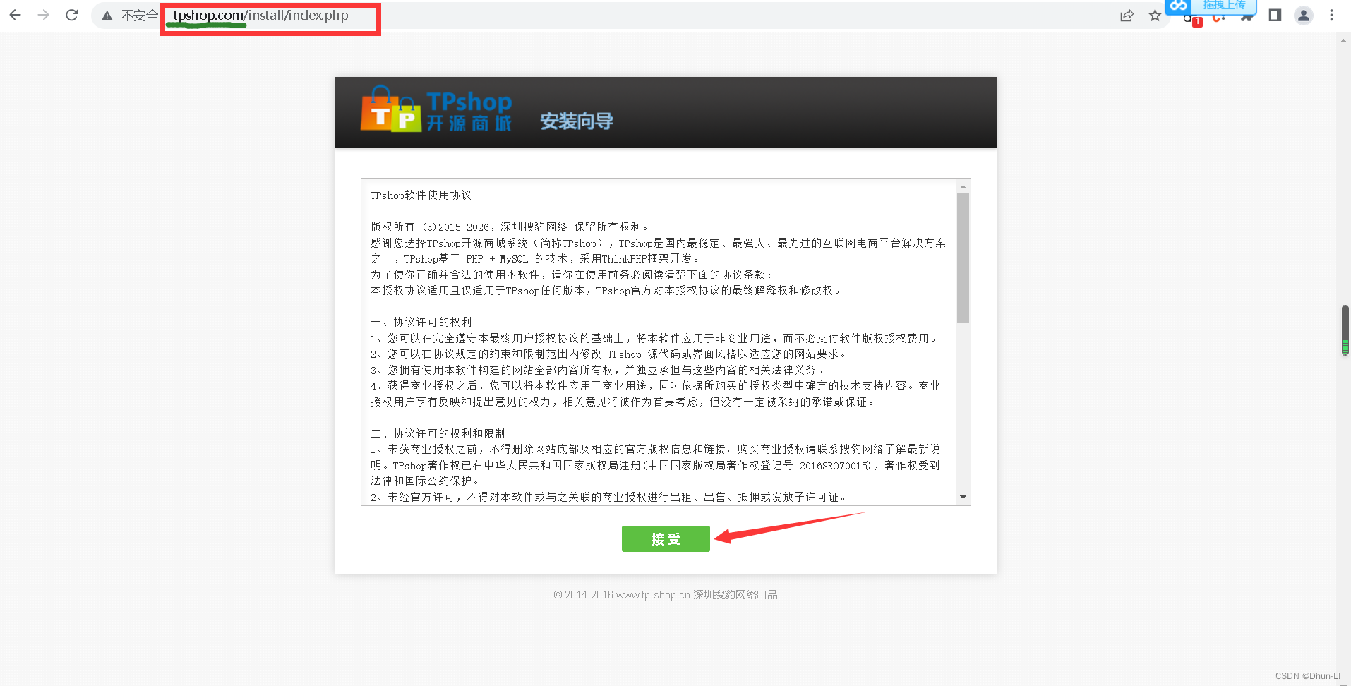 创建网站成功,在浏览器访问www.tpshop.com会出现安装界面: