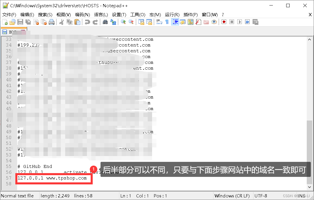 打开C:\Windows\System32\drivers\etc\hosts文件,在最后加入域名127.0.0.1 www.tpshop.com
