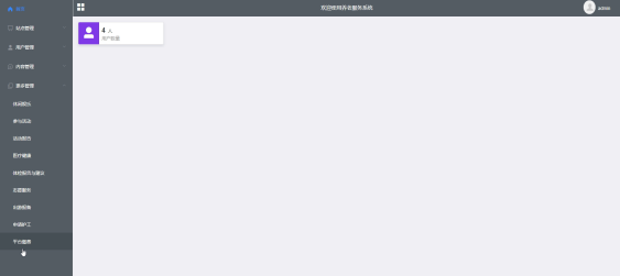 管理员登录进入养老服务系统可以查看,管理员:用户管理(管理员、注册用户)更多管理(休闲娱乐管理、医疗健康管理、出游报备管理、平台缴费管理、护工申请管理、志愿服务管理)等内容,如图5-2所示。