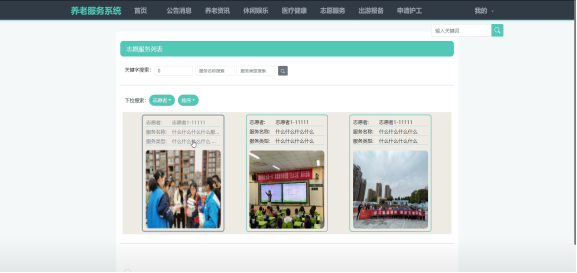用户登录进入养老服务系统可以查看首页、养老资讯、医疗健康、休闲娱乐、志愿服务等内容,如图5-7所示。