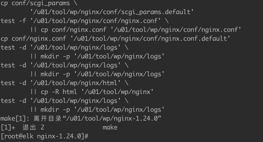 其中”--prefix“ 选项即为nginx安装目录,安装成功后,会自动生成此目录
