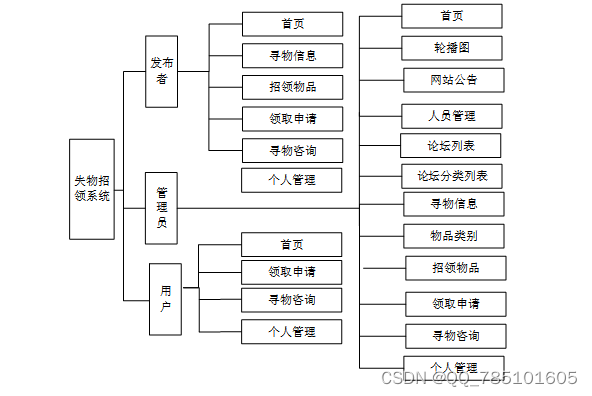 失物招领系统的功能主要分为前台用户根据自己的需求进行注册登录,浏览寻物信息并对选中的寻物进行发布操作。后台系统管理员因职责的不同,分为普通管理员和超级管理员,普通管理员主要对发布单进行处理,而超级管理员主要对注册用户,公告数据,寻物详细信息,招领详细信息进行处理。